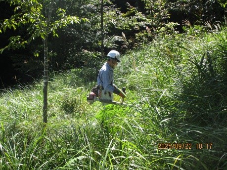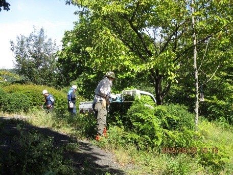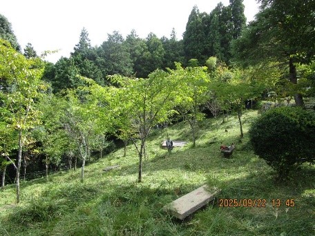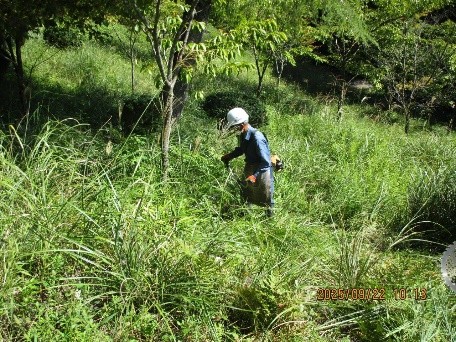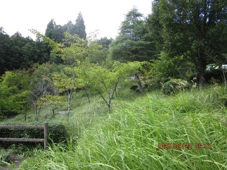市民参加による里山里地保全活動 · 2025/10/04 桜の苑 活動報告(1) 2025年9月22日(月) 晴れ カラッとした秋晴れの下、半年ぶりの1苑整備。苑内ではツクツクボウシの鳴き声が諸処に聞かれました。地上では昨年と異なり路上に張り巡るクズが少なく、斜面に生える草も背丈を超えるものは殆どありません。参加者20名の内、一部のメンバーで通路脇の植栽(ツゲ)の剪定等を行いましたが、メインは草刈り。10台を超える刈払い機を駆使して伸びた雑草の草刈りと集草作業を行いました。ただ、何分にも苑内が広く一部の作業を次回に持ち越しました tagPlaceholderカテゴリ: 桜の苑