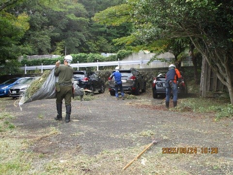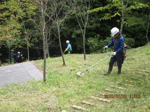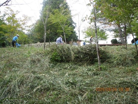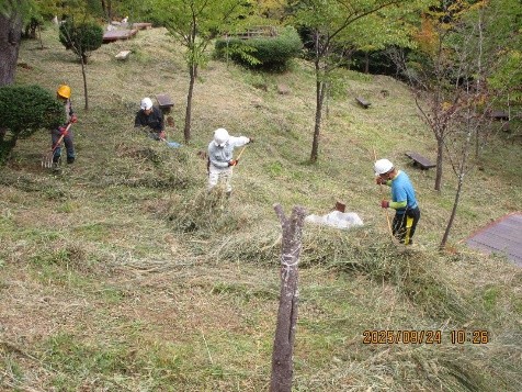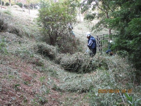 市民参加による里山里地保全活動 · 2025/10/04 桜の苑 活動報告(2) 2025年9月24日(水) 曇り 2日目は26名の参加を得て1苑の残務処理。刈り残し箇所を刈払機で刈ると共に前回残置した草も併せて集草し、所定の場所まで運搬して投棄する一連の作業を行いました。前回刈り取った草は乾燥して少し軽くなっているとは言え、足場の悪い斜面のため結構体力を消耗します。門前の植栽剪定も含めて作業が完了した後、3日目の活動地・2苑に使用機材を運ぶとともに全員が移動し、下見を行ないました。 tagPlaceholderカテゴリ: 桜の苑