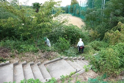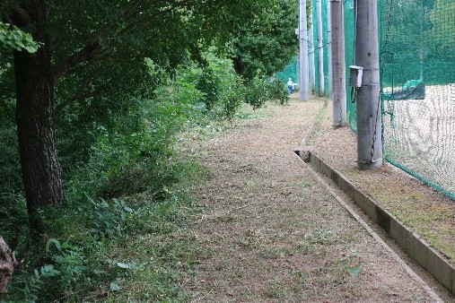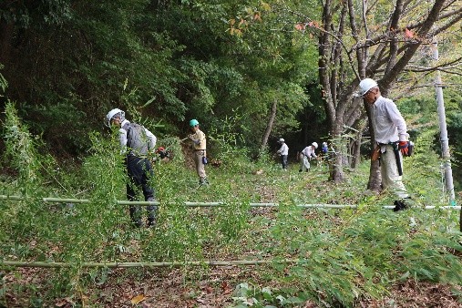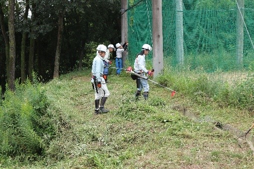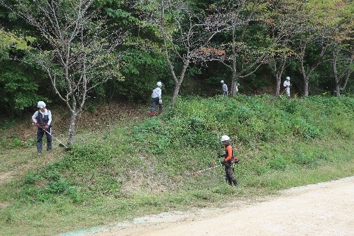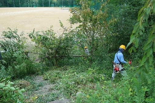 今回の活動は2面あるグランド周辺で行われ、リーダー一人を除く23人はA・B・Cの3班に分かれて作業が進められました。第一グランド西側(駐車場下)竹林の間伐と下草刈り(A班7名が担当)、同じく第一グランド東側の下草刈り(B班8名が担当)、第二グランド北西側の斜面下草刈りと竹林の間伐(C班8名が担当)が行われました。主に8台の刈払機を中心に、手鋸・剪定バサミなどを使って整備が進められました。